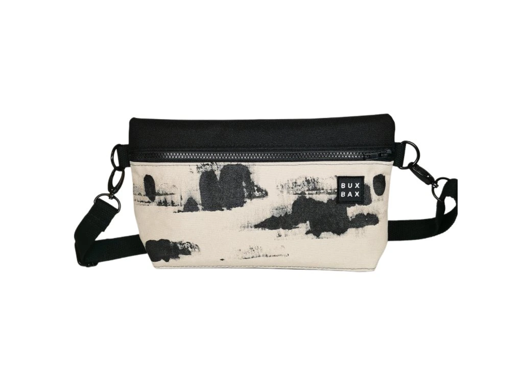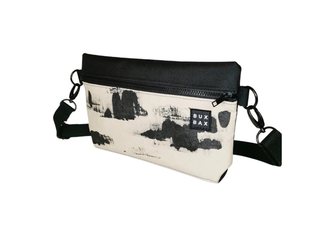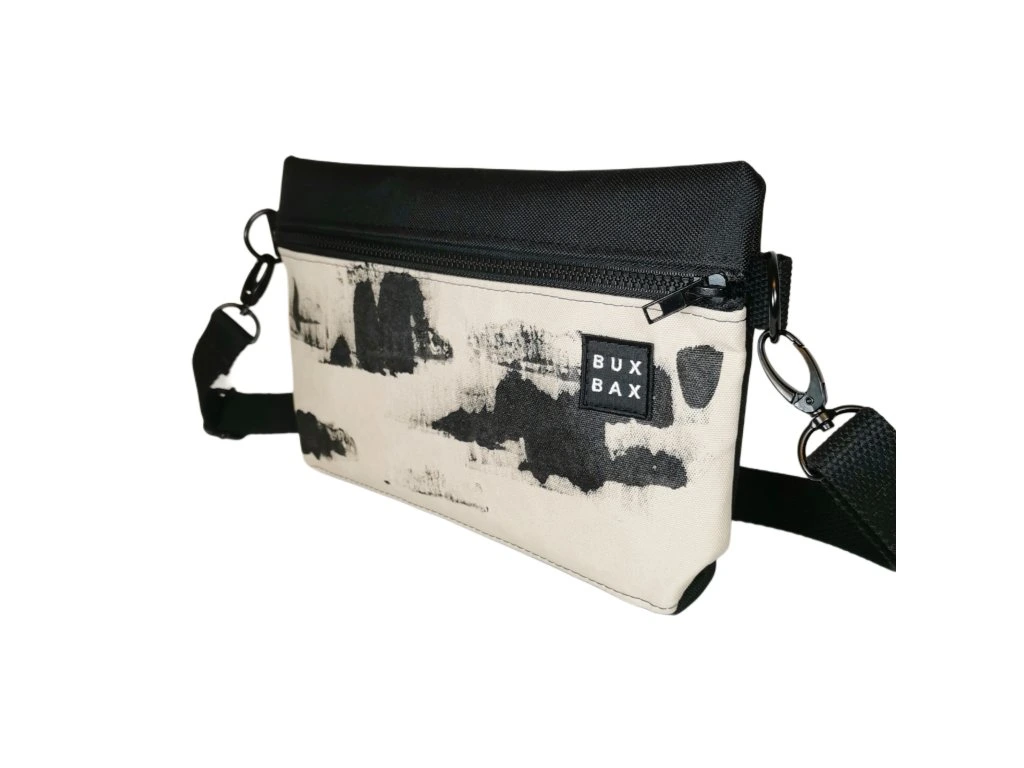 Ledvinka z černého kortexinu a béžové batohoviny s autorským motivem o velikosti 30 x 20 cm. Možno nosit jako ledvinku na prsou nebo na zádech. Popruh měří 120 cm a má posuvku. Kování je černé a popruh černý bavlněný.