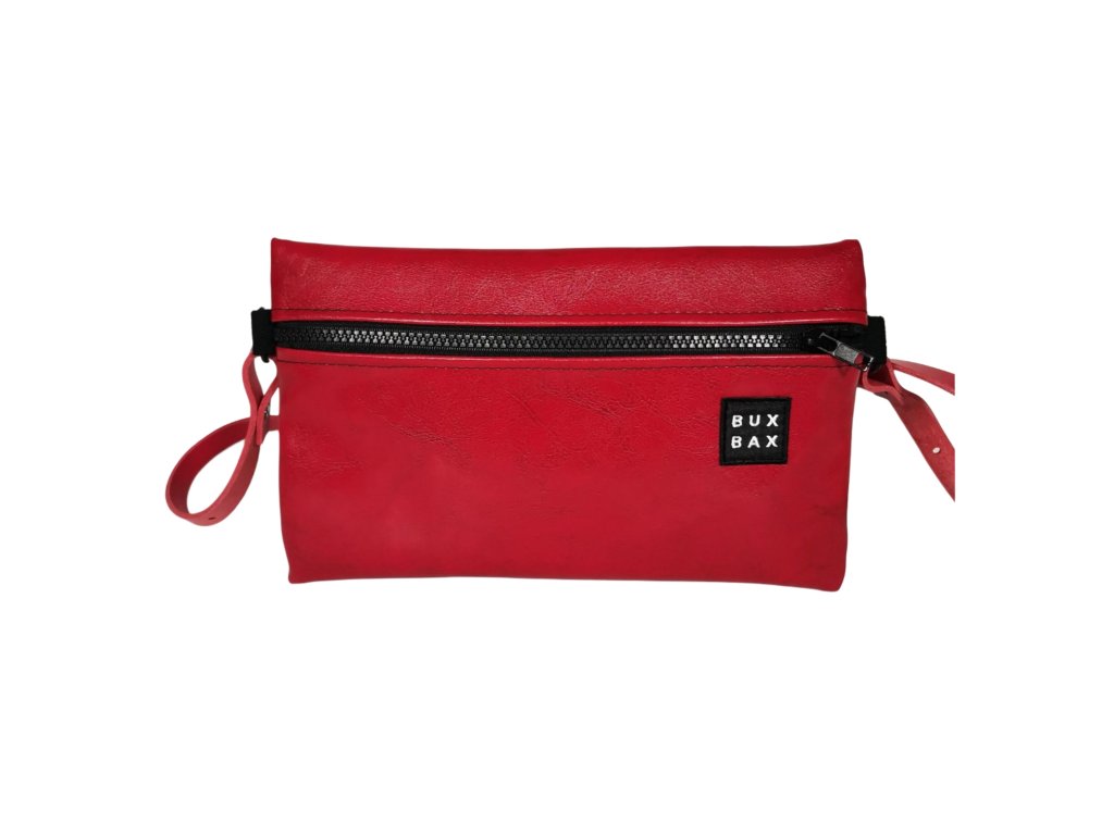 Ledvinka z červené koženky o velikosti 26 x 16 cm. Možno nosit jako ledvinku na prsou nebo na zádech. Popruh z červené koženky měří 110 cm a reguluje se posuvkou.