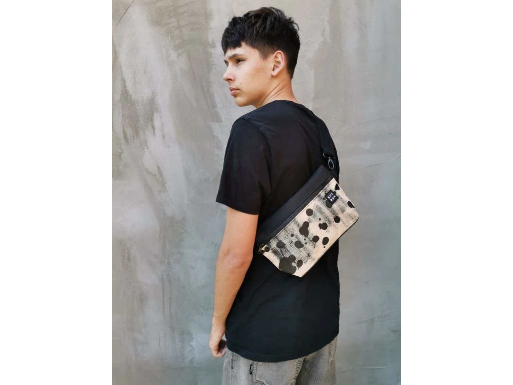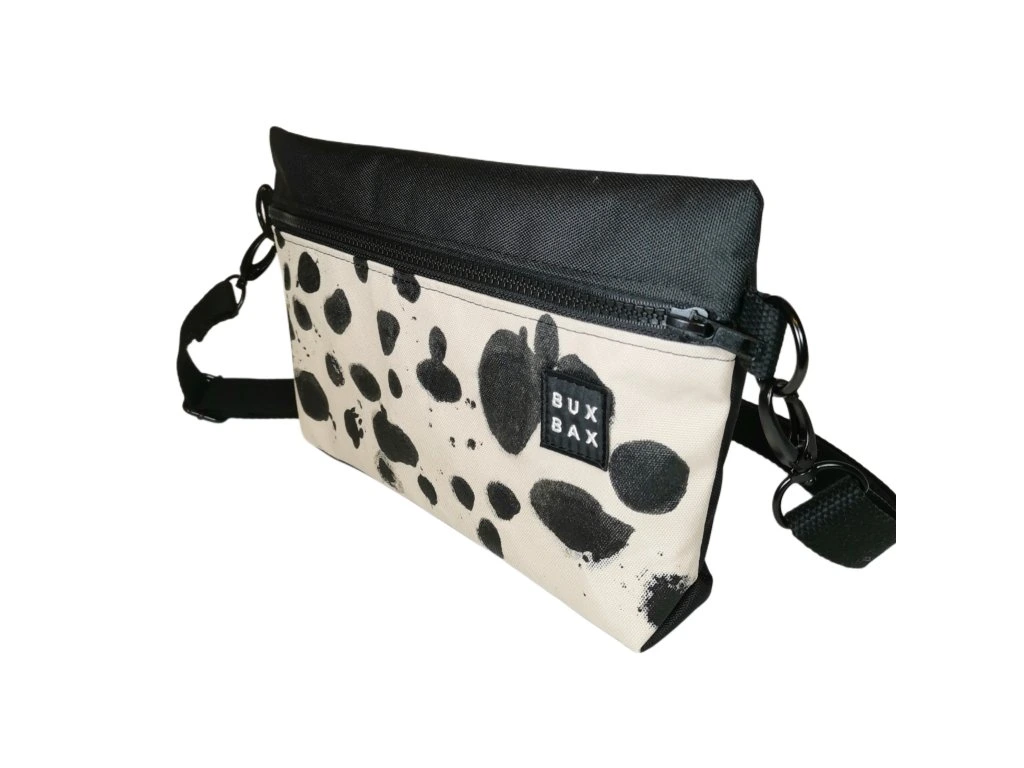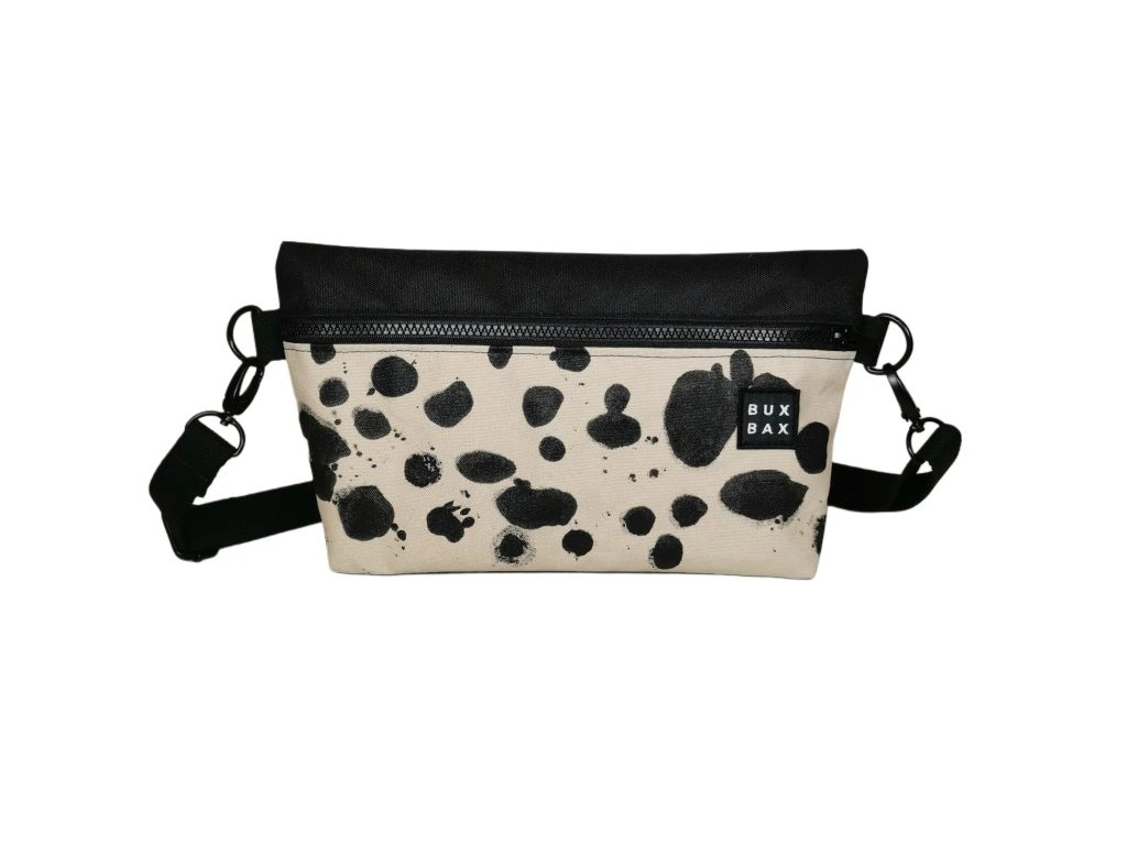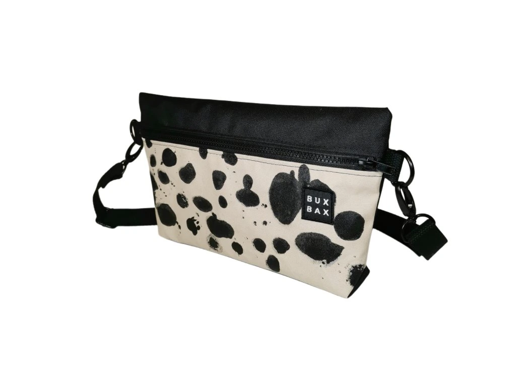 Ledvinka z černého kortexinu a béžové batohoviny s autorským motivem o velikosti 30 x 20 cm. Možno nosit jako ledvinku na prsou nebo na zádech. Popruh měří 120 cm a má posuvku. Kování je černé a popruh černý bavlněný.