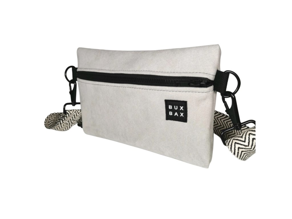 Ledvinka ze světle šedého umělého semiše o velikosti 24 x 16 cm. Možno nosit na prsou nebo na zádech. Černobílý popruh měří 120 cm a má posuvku. Je široký 4cm. Kování je v černé barvě.