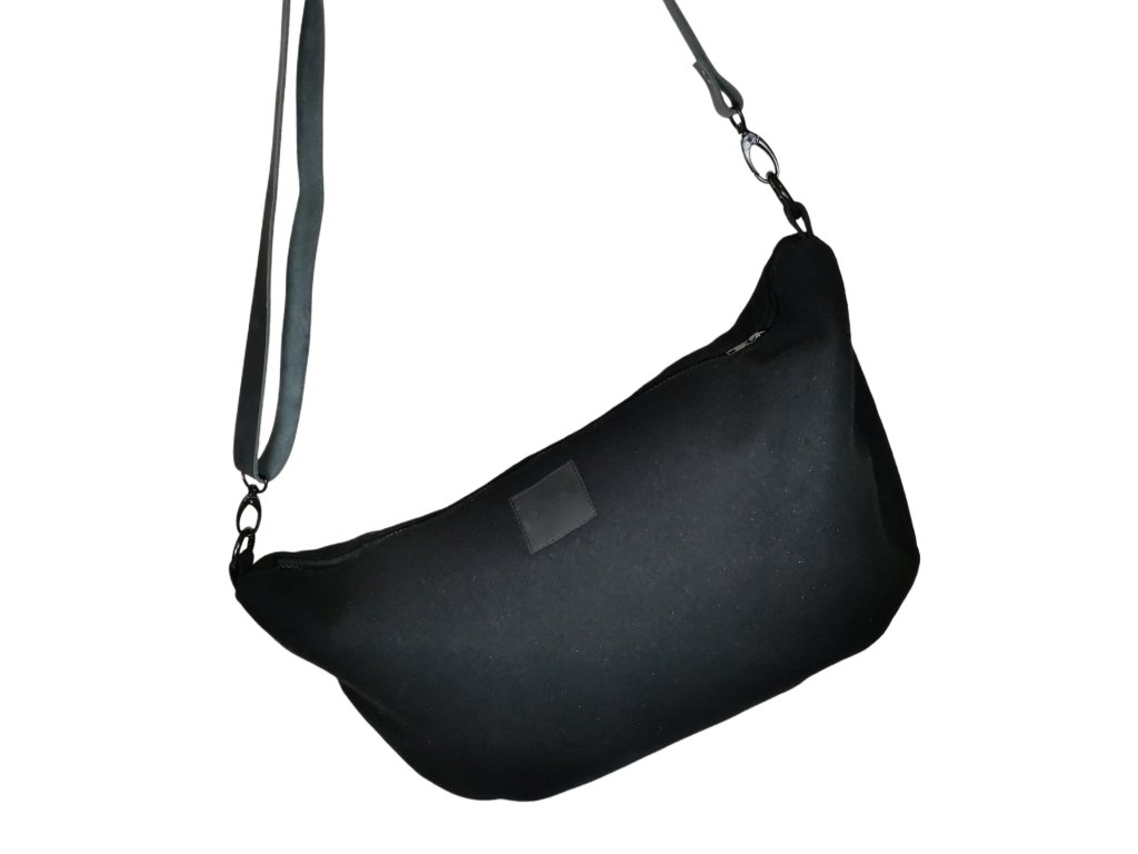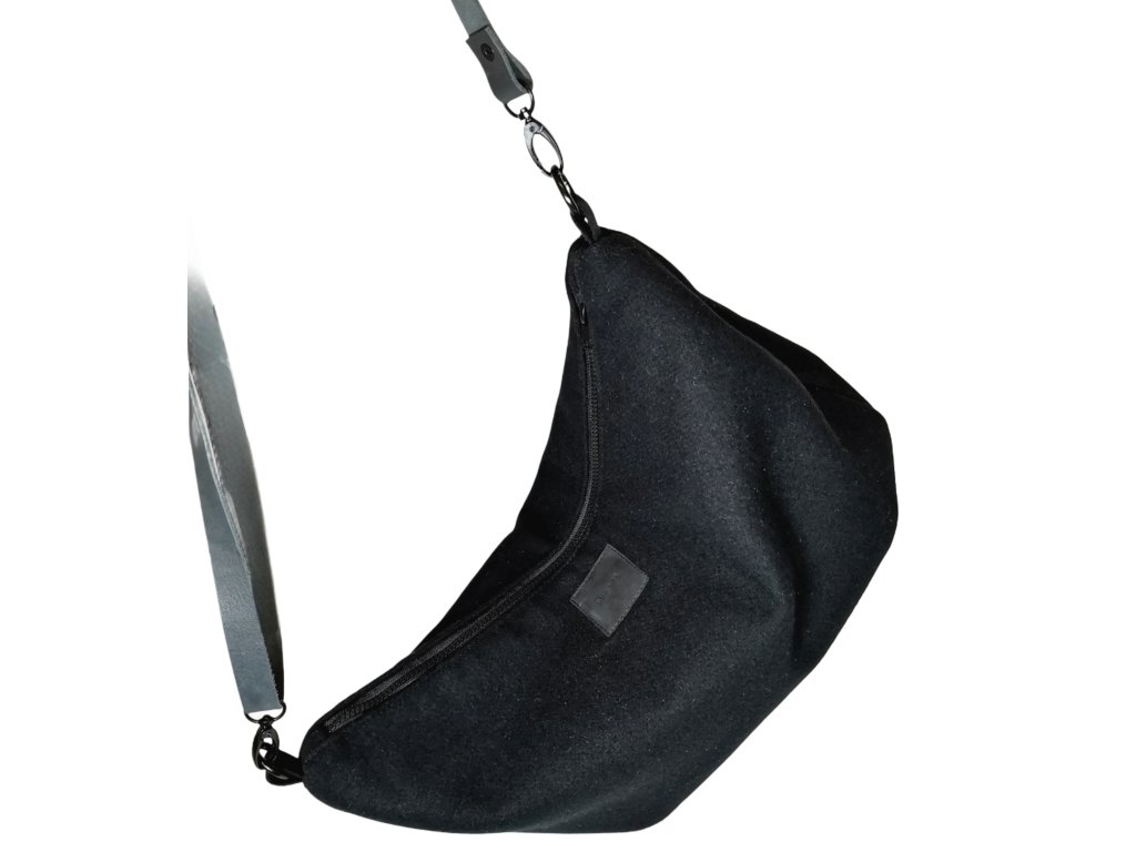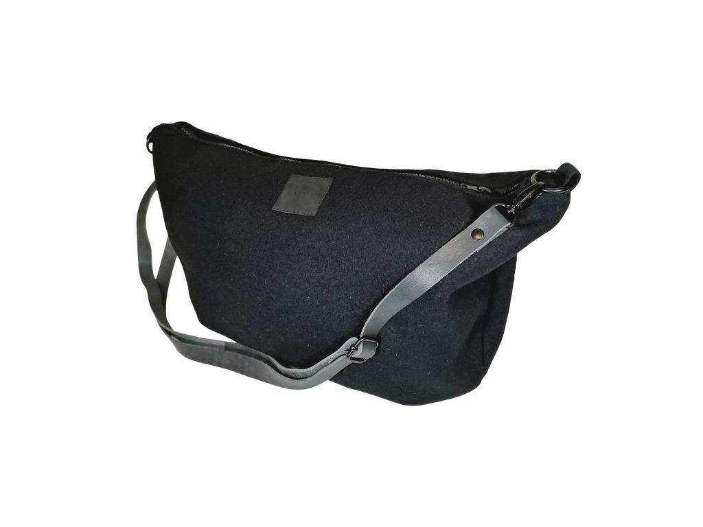 Taška z vlněné kabátoviny o velikosti 48 x 29 cm. Popruh je z hovězí kůže a měří 120 cm. Můžete si ho zkrátit posuvkou.