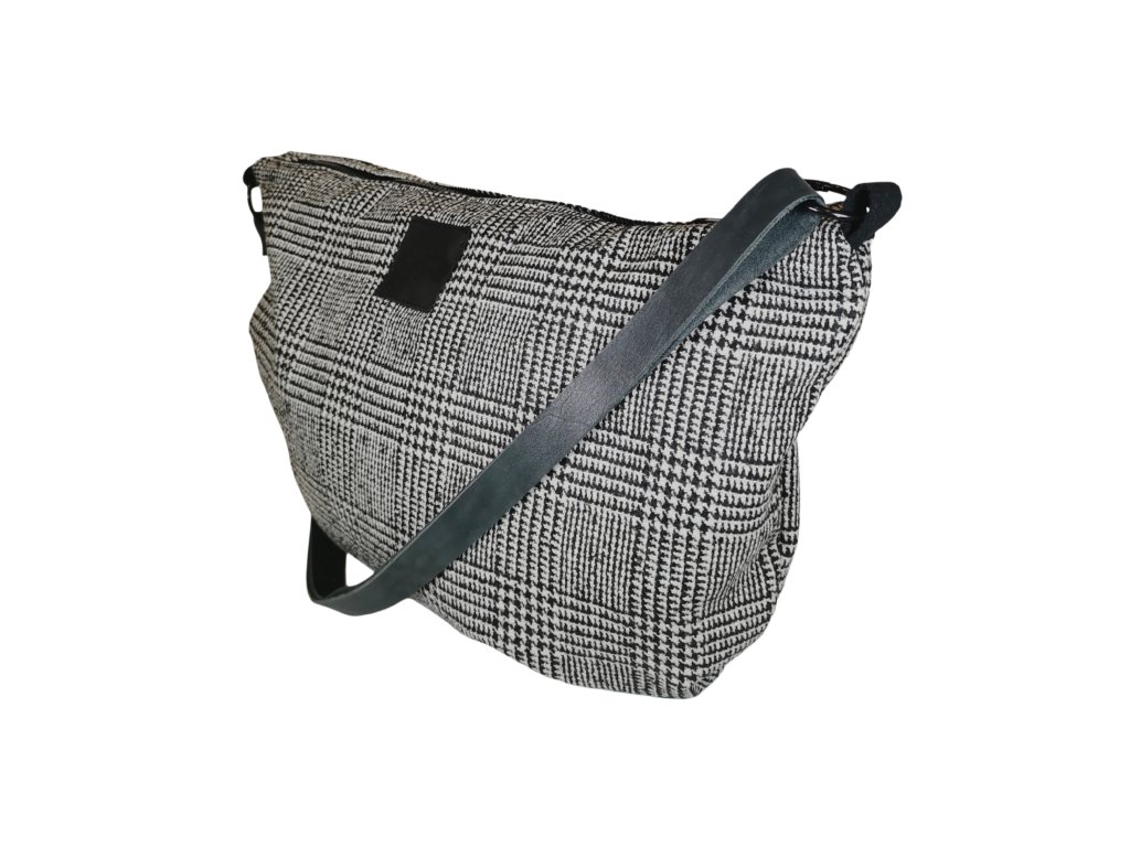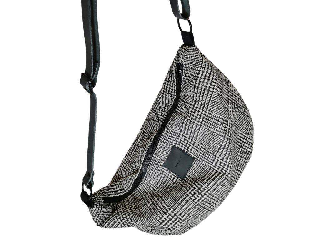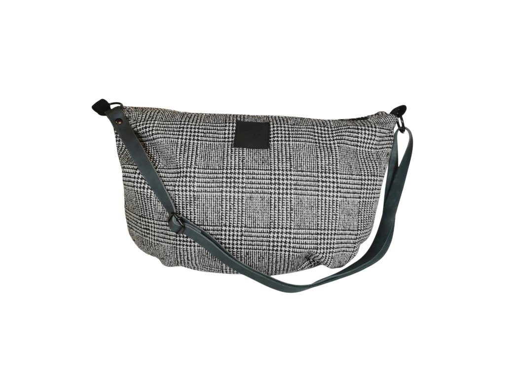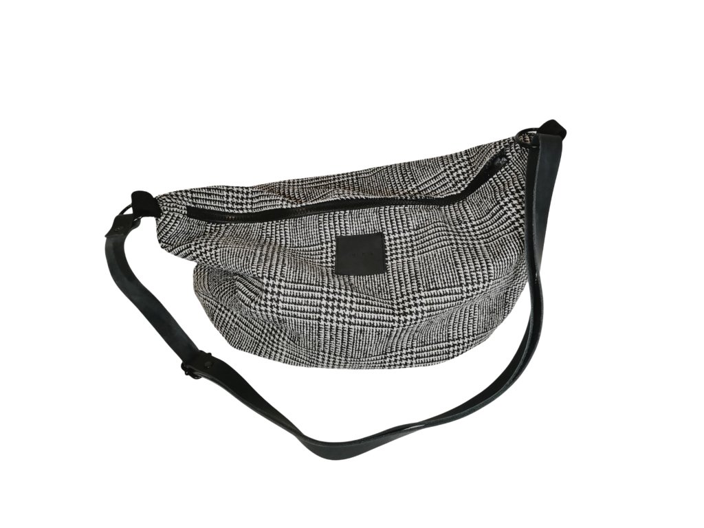 Taška z černobílé kabátoviny o velikosti 45 x 19 cm. Popruh je černý kožený a měří 120 cm. Můžete si ho zkrátit posuvkou.