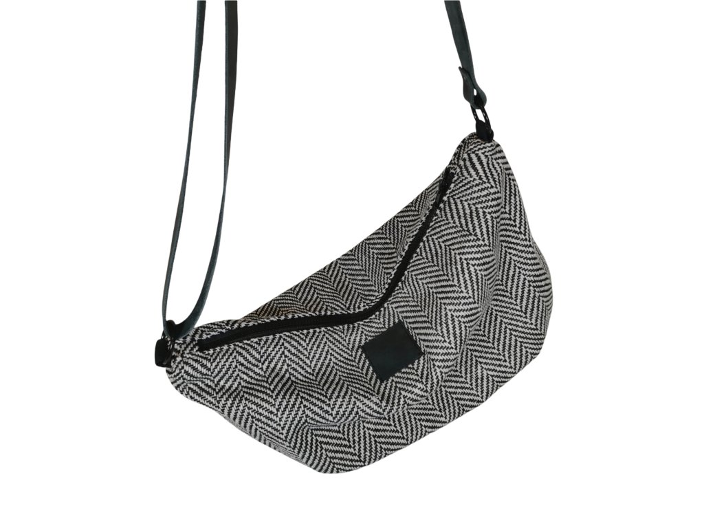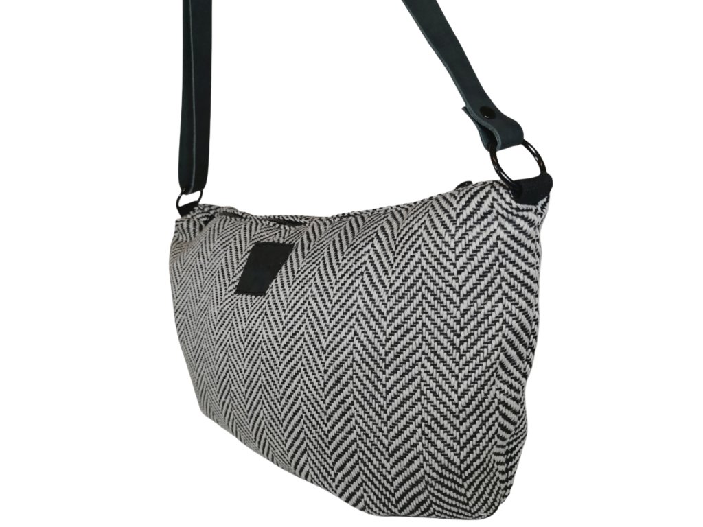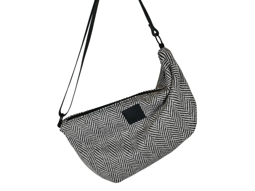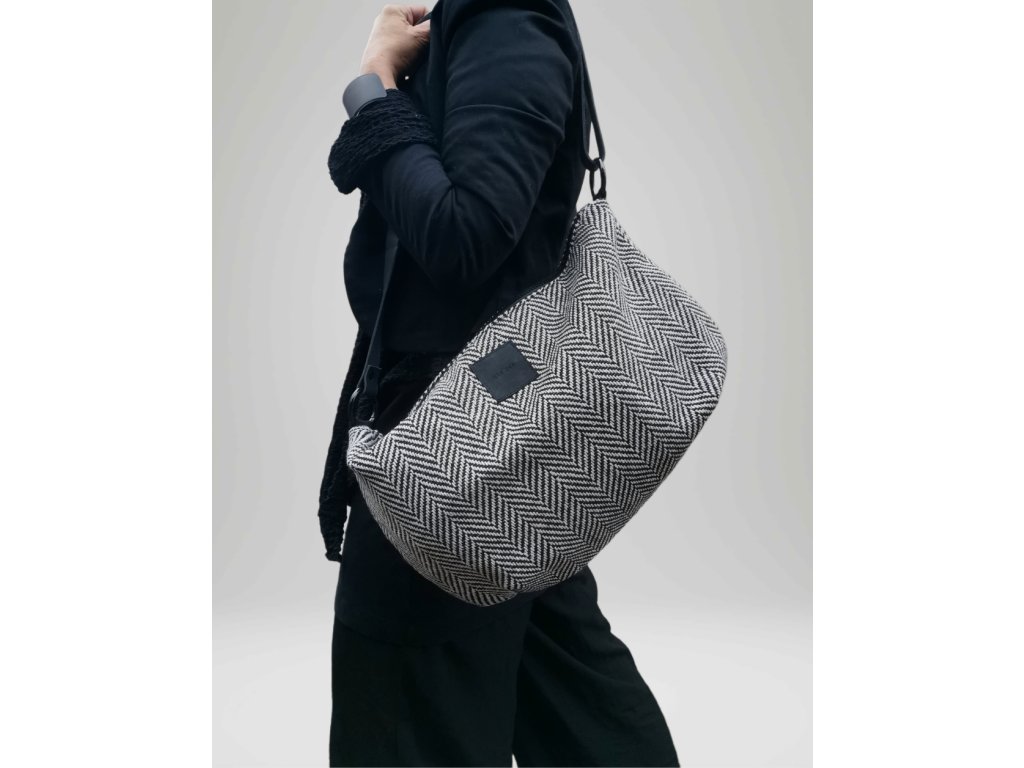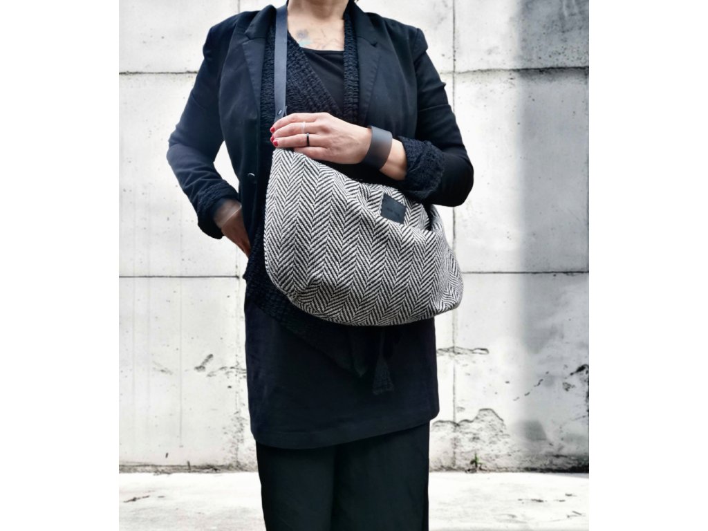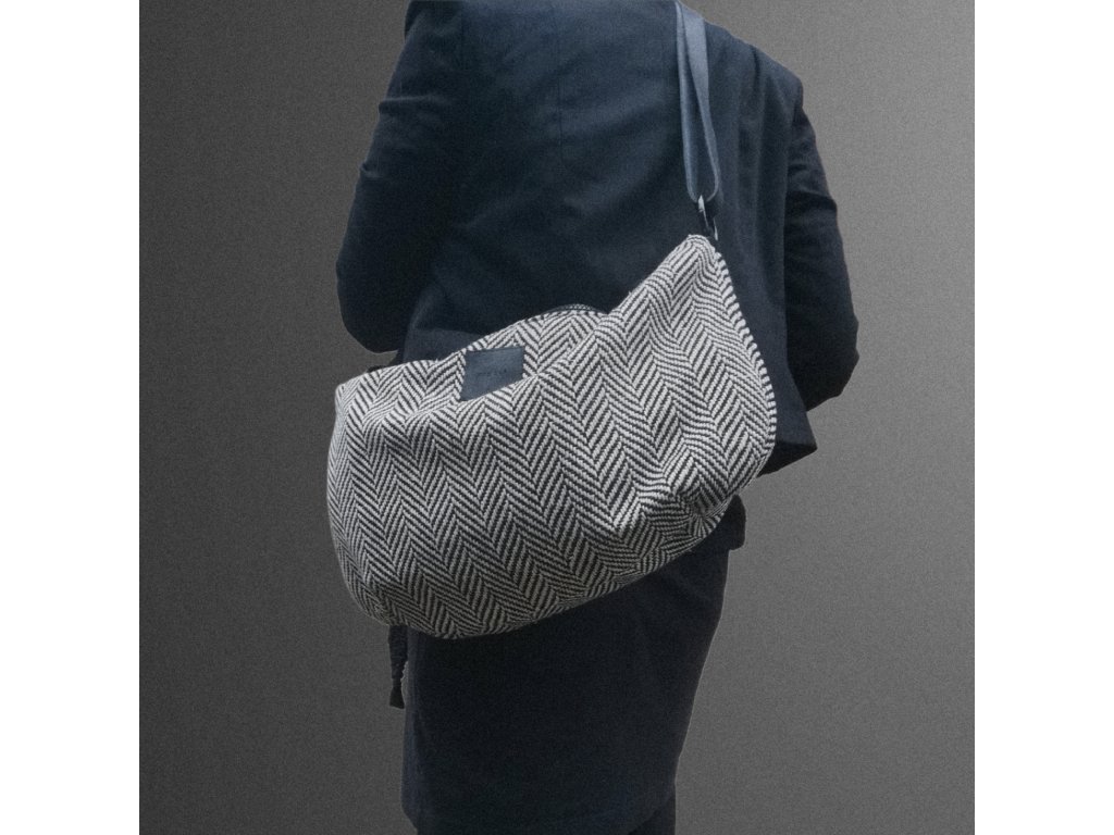 Taška z kabátoviny se vzorem rybí kosti o velikosti 45 x 29 cm. Popruh je z hovězí kůže a měří 120 cm. Můžete si ho zkrátit posuvkou.