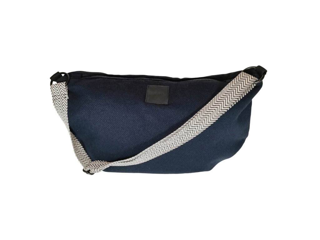 Taška z tmavě modré kabátoviny o velikosti 48 x 29 cm. Popruh je černobílý bavlněný , široký 4cm a měří 120 cm. Můžete si ho zkrátit posuvkou.